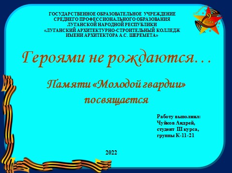 Цикловая комиссия бухгалтерского учета и экономических дисциплин объявляет благодарность студентам, принявшим участие в Конкурсе презентаций «Наши земляки», приуроченный году памяти подпольной антифашисткой молодежной организации г. Краснодона « Молодая гвардия»: